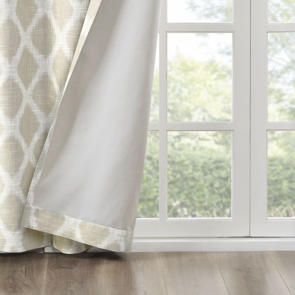 Introducing a modern and stylish take on energy efficiency, our SunSmart Blakesly Printed Ikat Blackout Panel is the perfect update to any room. Fresh and chic, this window panel features a printed taupe ikat design on a textured firm base fabric, creating dimension for a cool and casual look. Finished with a two pass foamback and bonding technique, the panel is enhanced to block most sunlight and create a significant barrier to reduce outside noise. Silver grommet top detail makes it easy to hang, open, and close panels throughout the day; while fitting up to a standard 1.25' diameter rod. With considerable energy savings and a high level of added privacy, this blackout panel is perfect for home offices, family rooms, and bedrooms. Give your space a beautiful, one-of-a-kind update with this contemporary blackout window panel. Lighting level: Heavily Shaded Ambiance.