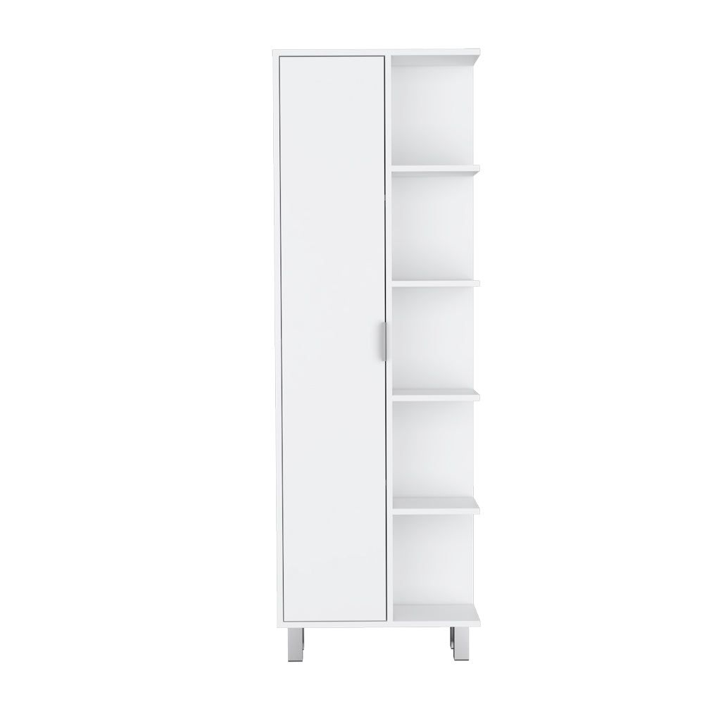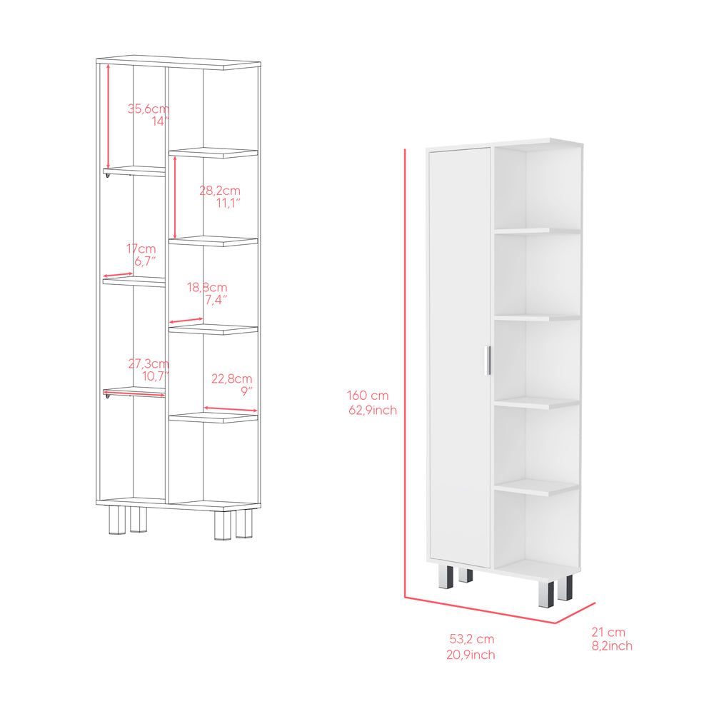 Upgrade your bathroom's charm and functionality with the Sandy Linen Cabinet. This chic, white storage masterpiece towers at an elegant 66.93 inches. Its thoughtful design features seven shelves, three hidden behind a door to keep your linens and necessities neatly organized. Adorned with minimalist hardware and crafted with a durable finish, the Sandy Linen Cabinet complements any modern bathroom décor.Dimensions: Height: 62.9'Width: 53.2' Depth: 8.2'Furniture Type: Ready to assemble (full assembly required).Certifications: CARB phase II compliant – TSCA Title VI Compliant.Warranty: 1-year warranty coverage in wooden parts- 1-year warranty coverage in hardware pieces since its manufacturing date is found in the lot number printed in the product box.Shipment details: Free shipping to the 48 contiguous states - delivery time: Between 2 and 5 days, depending on the customer's location, season, and weather factors.Other details: This product does not include decorative or background elements; Check that the box is in good condition and well packed and check with the help of the manual that the corresponding parts have been included; For more information regarding warranty, shipment details, cancellations, returns & replacement parts go to the bottom section of our website to learn more; Installation & Assembly Instructions included.