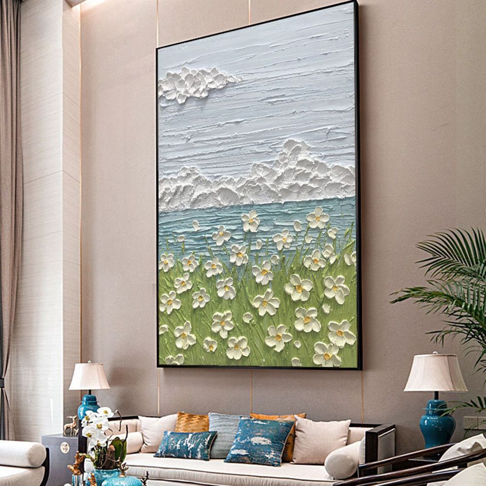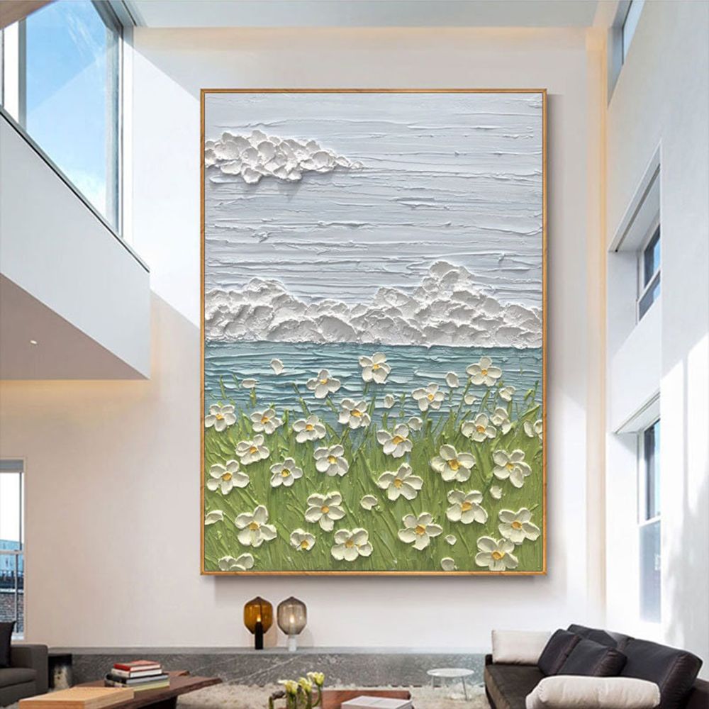 Home > Hand Painted Oil Painting Abstract Art Small White Flower Ocean Landscape Painting Nursery Decor Kids Wall Art Textured Art Palette Knife painting