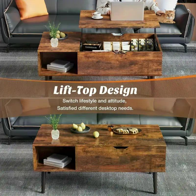 Folding Desktop Design===The coffee table adopts a lifting structure to form a double layered desktop with staggered heights. When you suddenly want to work or eat, you can easily pull up the upper desktop and instantly transform it into a highly suitable desk.Hidden Storage Space===After the desktop is raised, there is a large storage space below, which can be used to store books, cards, board games, snacks, and other items that need to be isolated from water and stains. The side cave can be used to place family shared items such as cups.Safe and Reassuring===The lifting table takes the usage steps as the starting point, and a concave arc hole is reserved on the side for reaching out, to avoid being accidentally squeezed and injured.Material===The coffee table is made wood, which is thick and stable. The diagonal leg design expands the supporting area of the table and improves stability. The lifting mechanism adopts a thickened steel frame structure, which is frequently used without jamming and making noise.Simplicity and Practicality===The multifunctional living room furniture brings more comfort and convenience to your life. The colors are simple and understated, making it easy to integrate into different decoration styles. The mechanical lifting design also adds fun to your space.