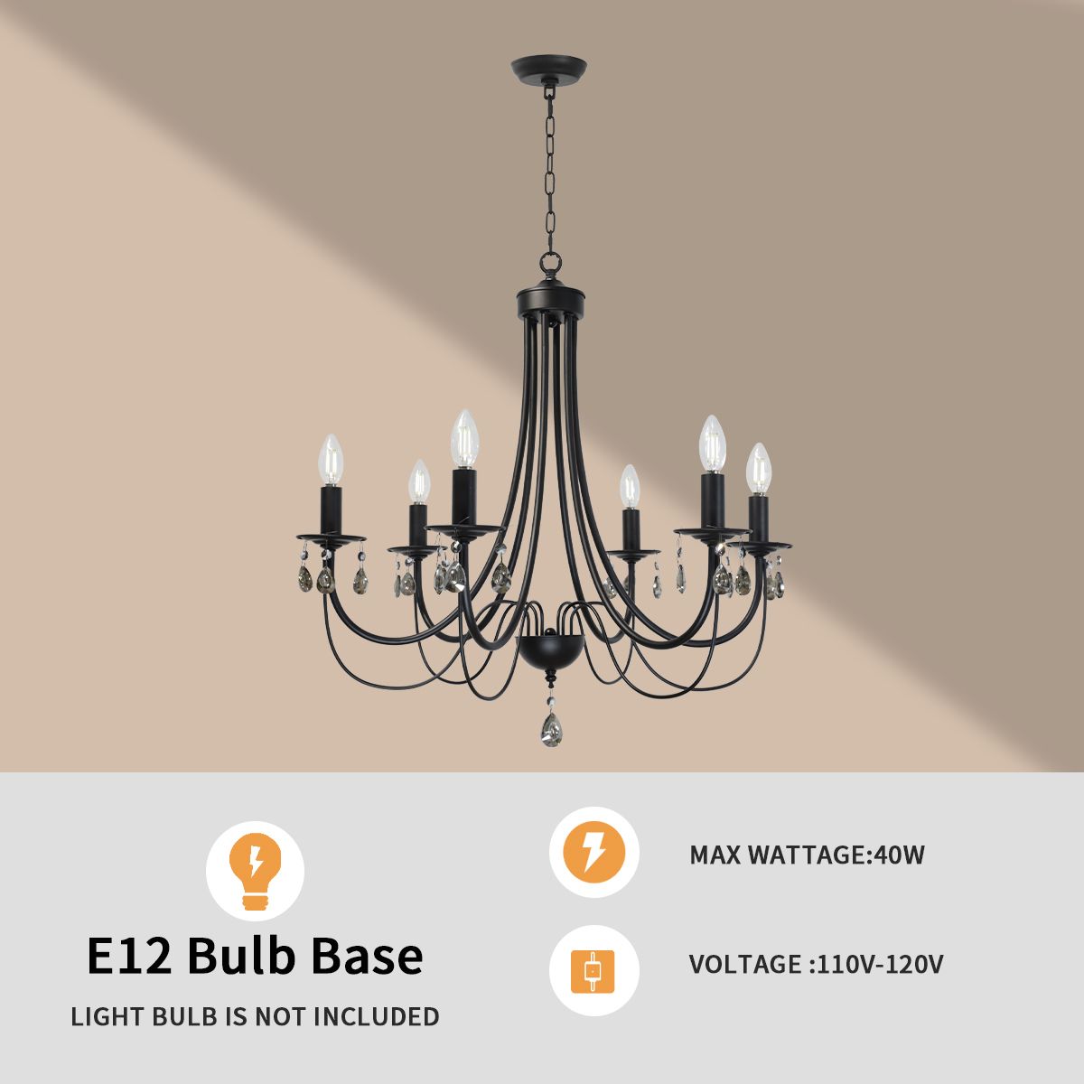 3.Black Chandelier with ETL certification E12 socket and cable, Need 6 bulbs (not including bulbs) dimmable: dimmable when used with dimmable bulbs and compatible dimmer switches can work(not included).