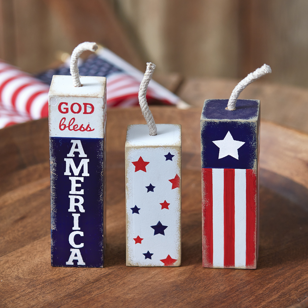 Home > Rustic Set of Three Decorative Firecracker Blocks for Home Decor - Handcrafted Wooden Firecracker Decor